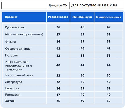 Меняются минимальные баллы по некоторым предметам. Они повышены по следующим предметам: физика — было 39, стало 40; история — было 36, стало 40; информатика — было 44, стало 46; иностранный язык — было 30, стало 40; биология — было 39, стало 40; химия — было 39, стало 40. По русскому языку, математике профильного уровня, литературе и географии минимальный порог — 40 баллов. По обществознанию выпускникам нужно будет набрать минимум 45 баллов.